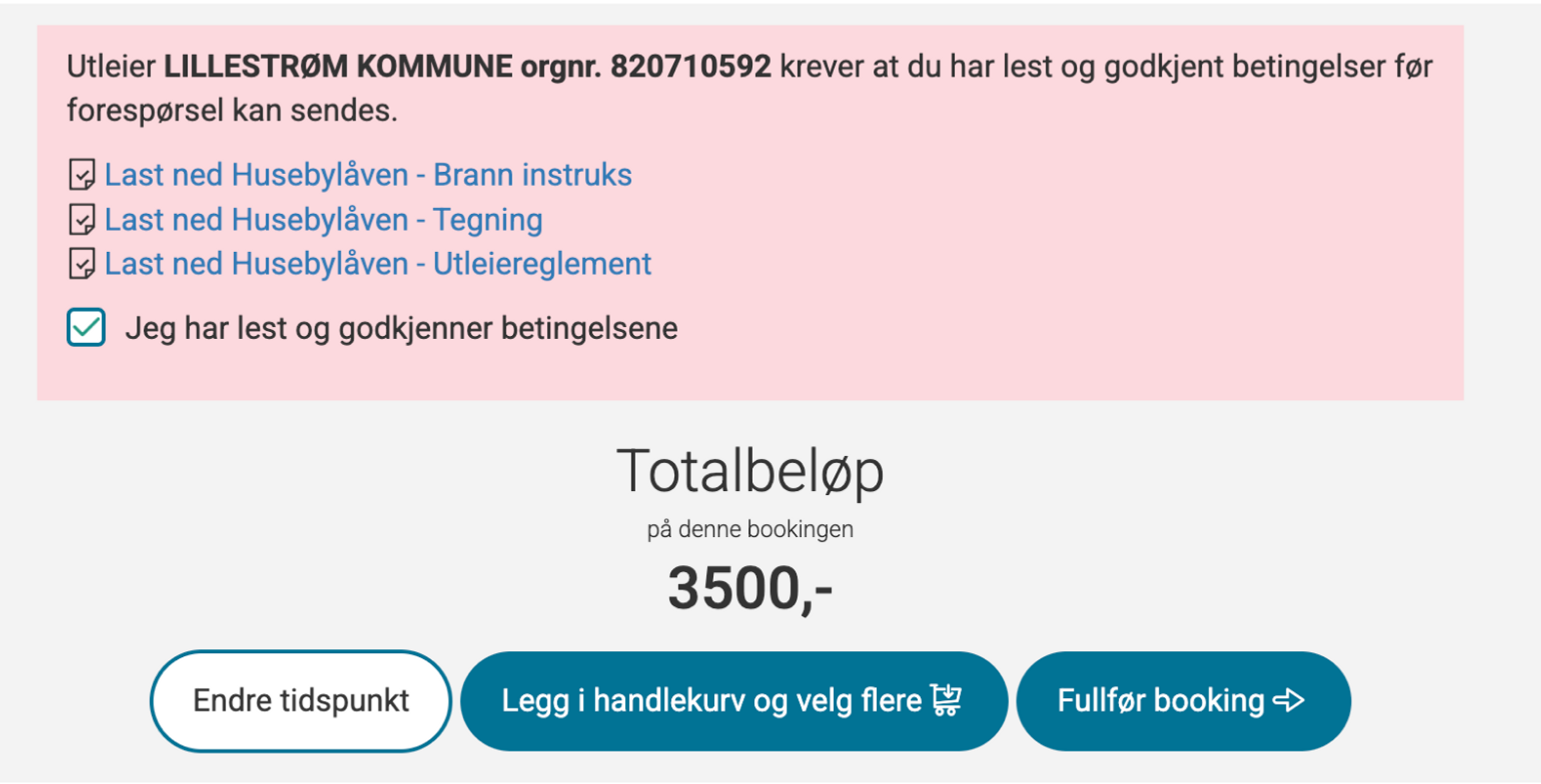 Ønsker du å gjenta leien på samme lokale eller leie andre lokaler trykker du “Legg i handlekurv og velg flere”. For å fullføre bookingen trykker du “Fullfør booking”. Husk å sette deg inn i gjeldende betingelser for lokalet.