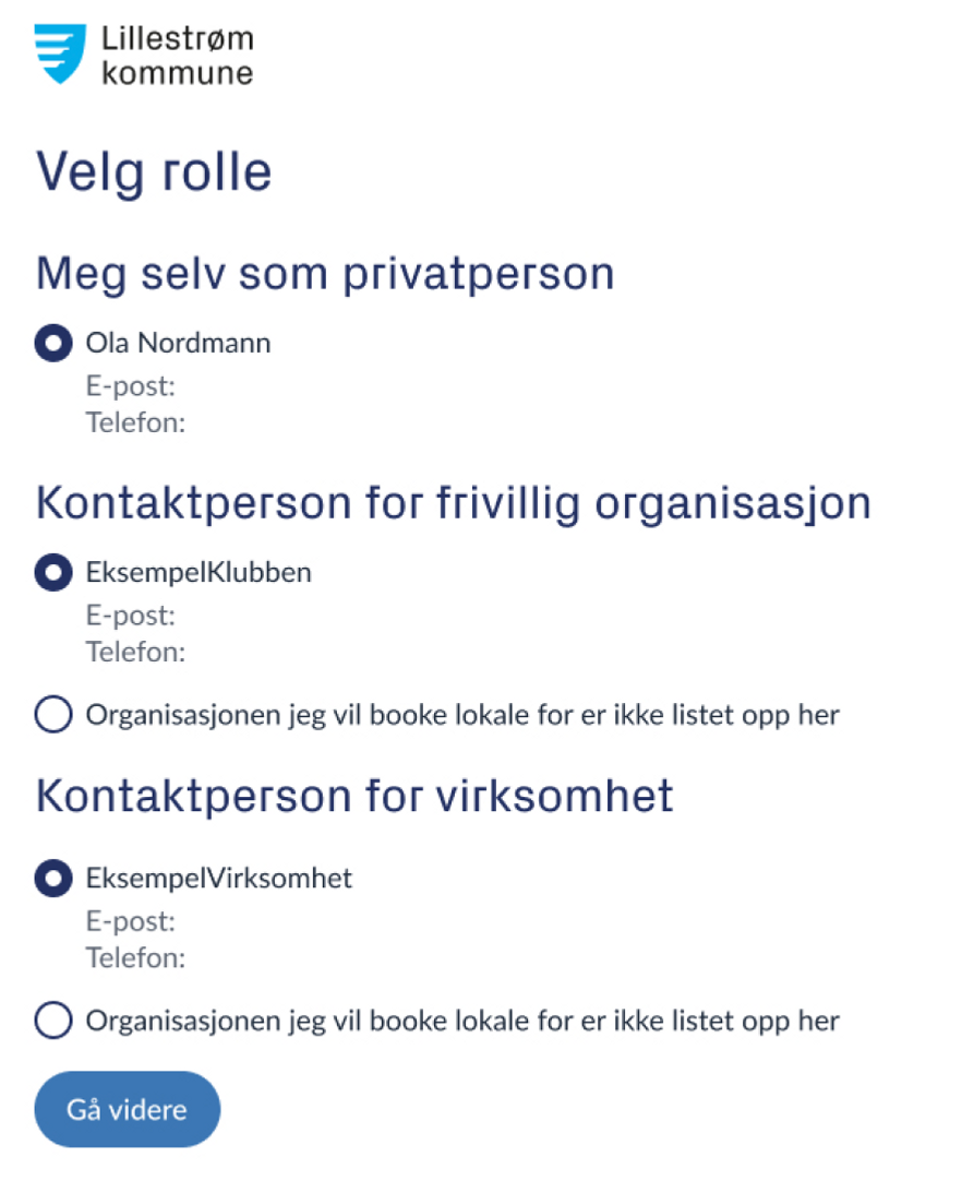 Logg inn med ID-porten og velg rolle for bookingen; om du booker som privatperson eller representerer en frivillig organisasjon eller en virksomhet. Husk at du må være registrert som kontaktperson i lag- og foreningsregisteret (åpnes i ny fane) for å kunne leie på vegne av en frivillig organisasjon. Bekreft rollevalget ditt og gå videre.
