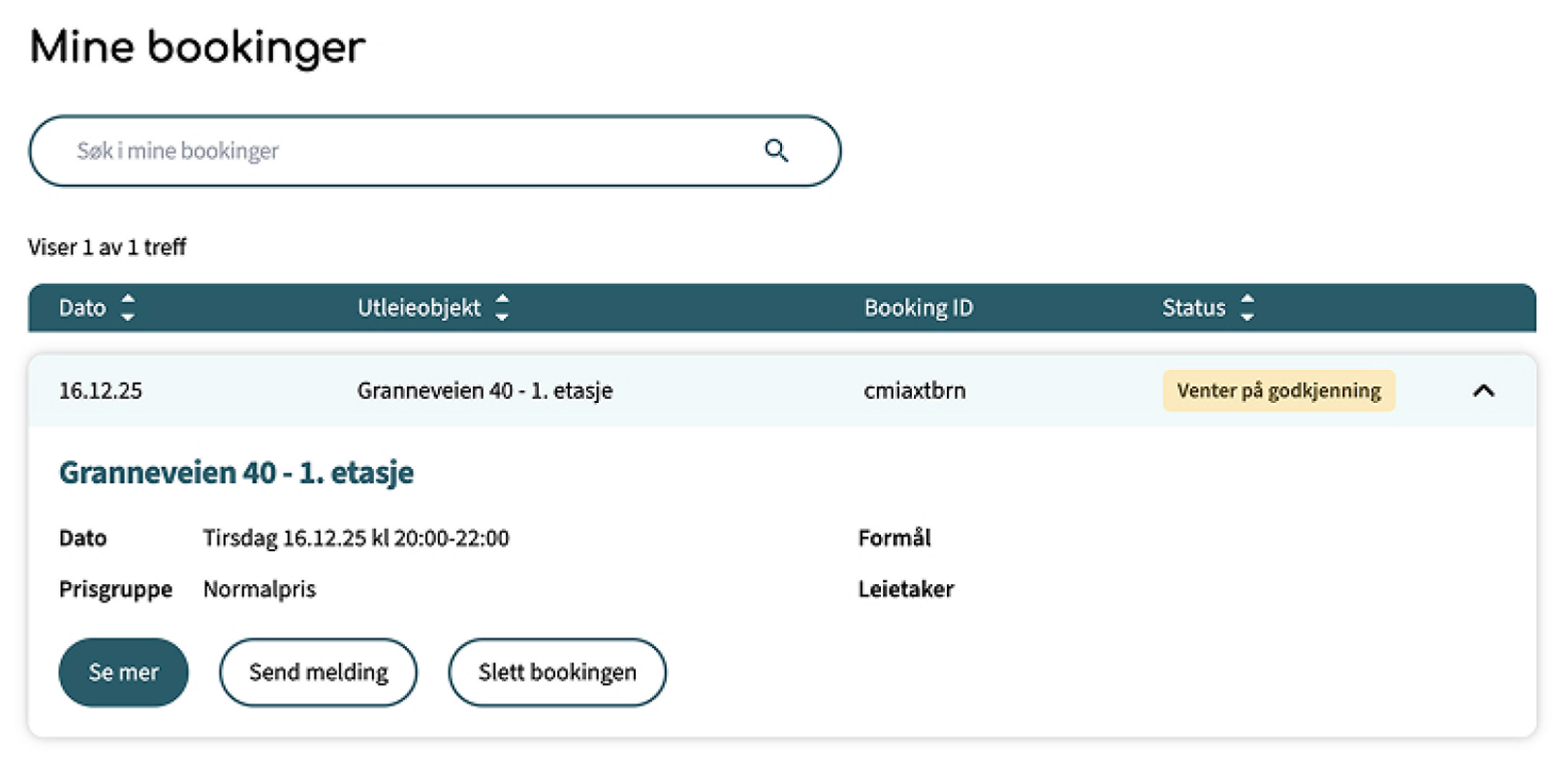 Når bookingforespørselen din er registrert, blir du sendt til oversiktssiden «Mine bookinger». Her ser du status, du kan sende melding til utleieansvarlig og kansellere bookingen.